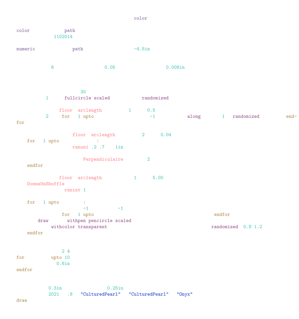 This gallery presents then creations built on a constant modus operandi: randomness. All the elements are random: colors, forms… These vector images can be created with infinite details, i.e., the number of patterns can be (almost) unlimited, and at any size (from 1x1 feet to 100x100 feet!). These creations are made in Metafun, an extension of the Metapost language.